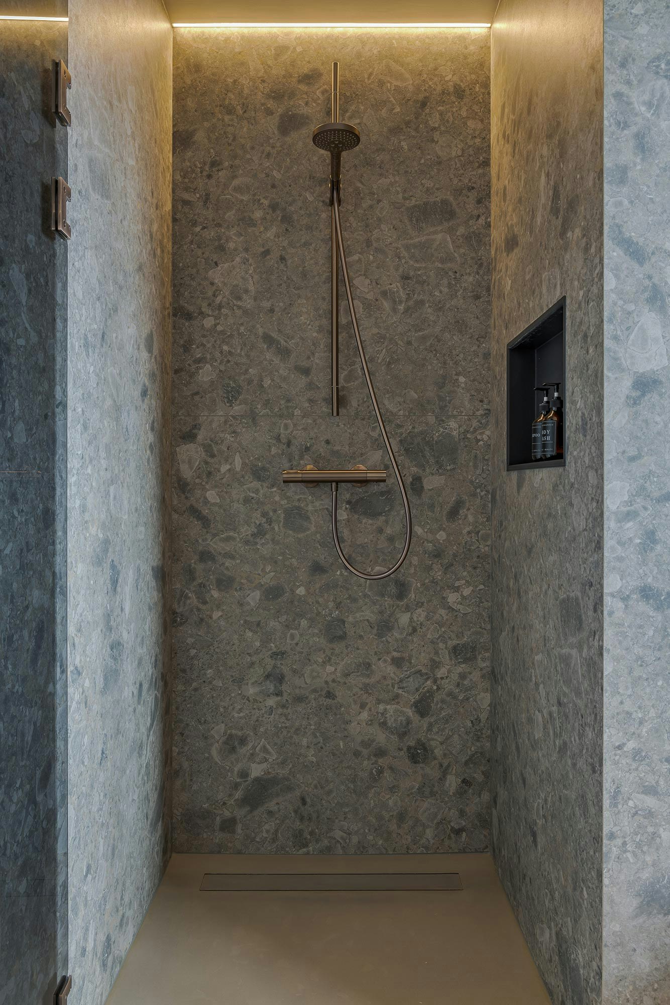 On the ground floor, there is a sliding door that provides access to a spacious walk-in closet, which in turn leads to a luxurious bedroom and bathroom. The open connection between the spaces is again clearly visible here. The bedroom has a custom-designed headboard, and the bathroom features a double shower and sauna. Once again, Dekton, in the color Taga, is the material of choice for the finish, while subtle lighting creates a serene and calm atmosphere. Details, such as the knobs on the glass doors of the bathroom, executed in the same color as the edge of the mirror, give a refined, unique appearance.