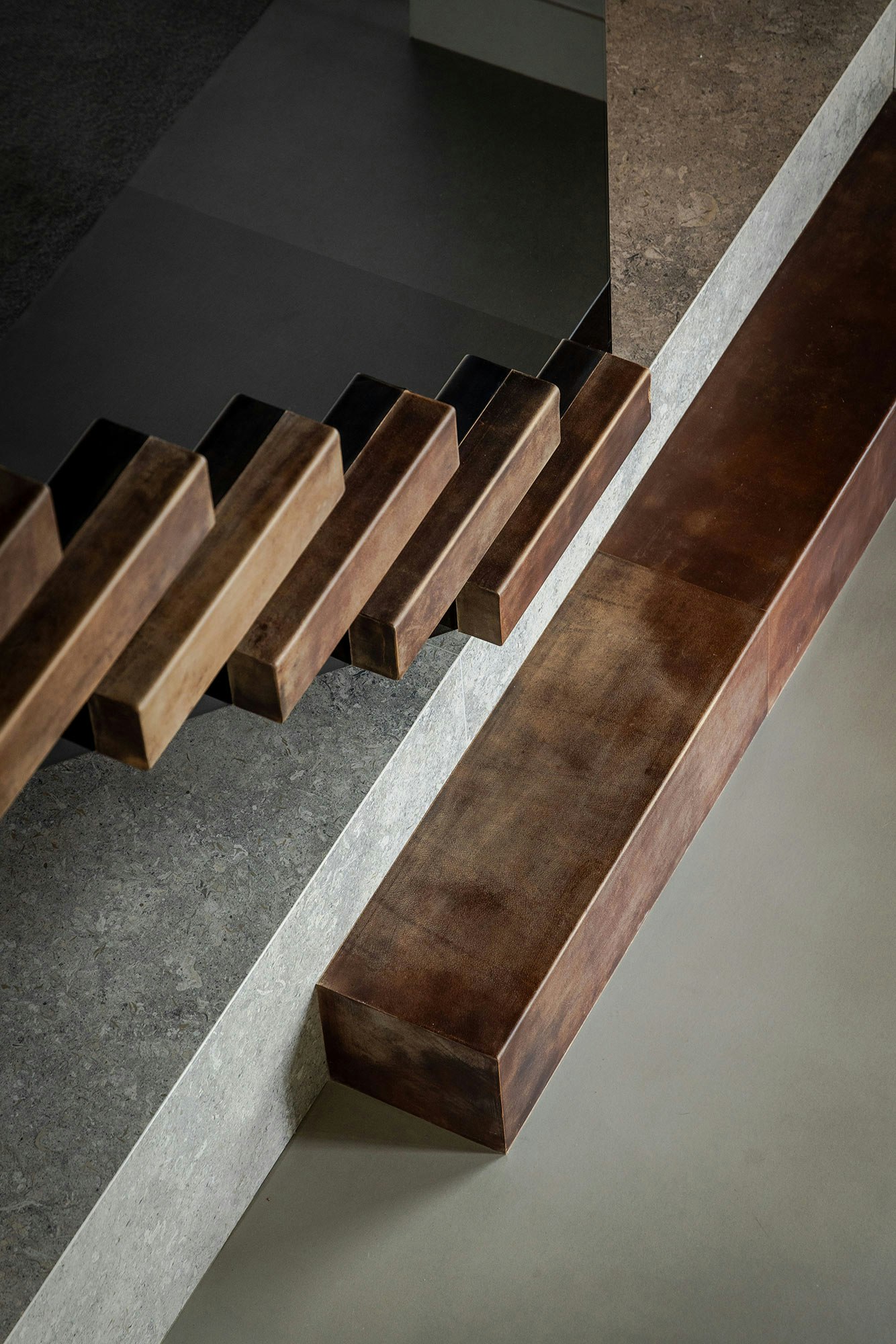The entrance of this villa is truly impressive, with leather steps and a highlighted artwork located on a plateau under the stairs, covered with the luxurious material Dekton, in the color Grigio. The high, open space, combined with the imposing lighting, enhances the inviting feeling of the home.