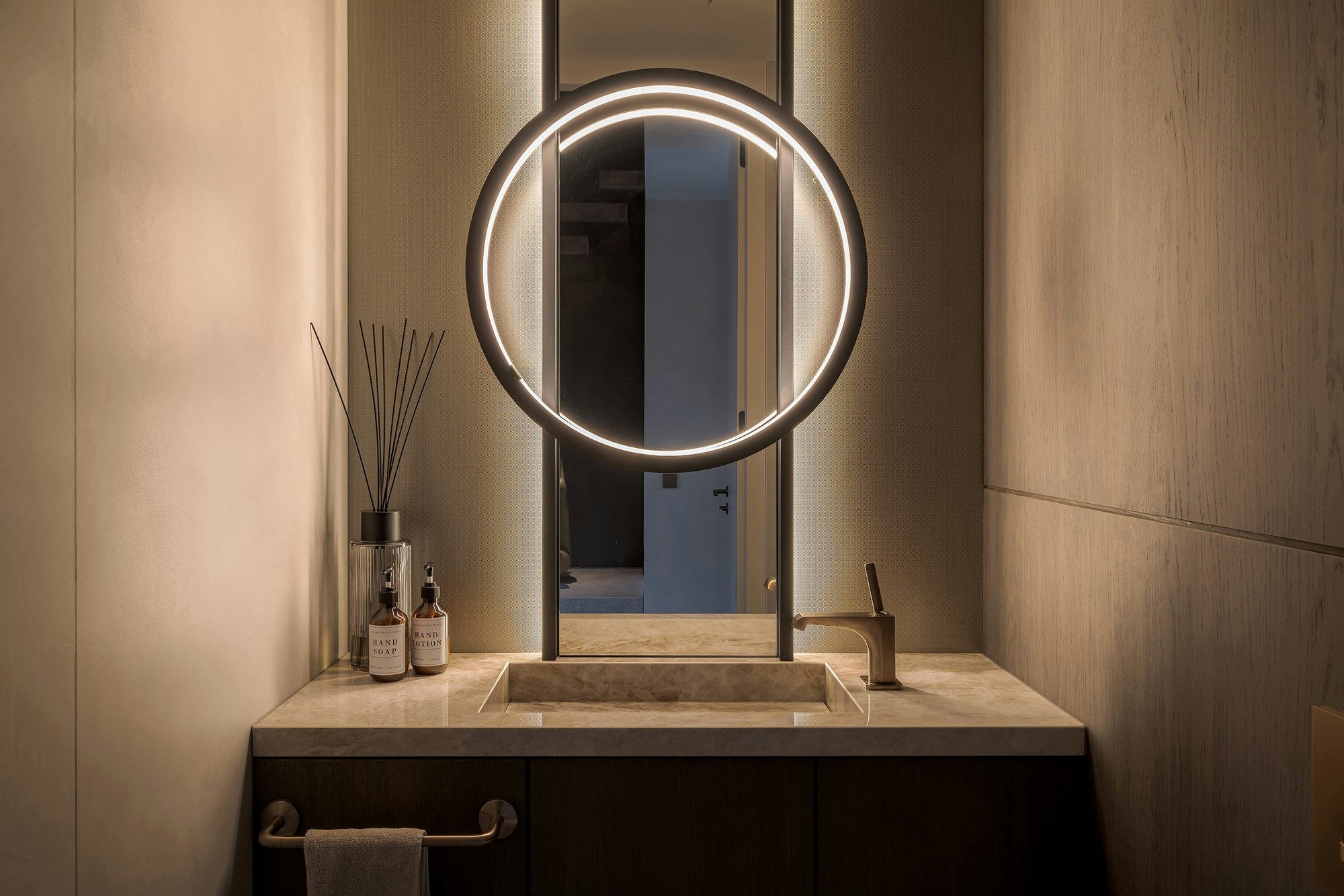 Studio MBC created a unique interior in this villa, where custom work, natural materials, and a well-thought-out lighting plan come together. The result is a chic home that exudes luxury and comfort, with a design that combines the robustness of natural materials with refined details and innovative lighting. This creates a serene oasis by the water.