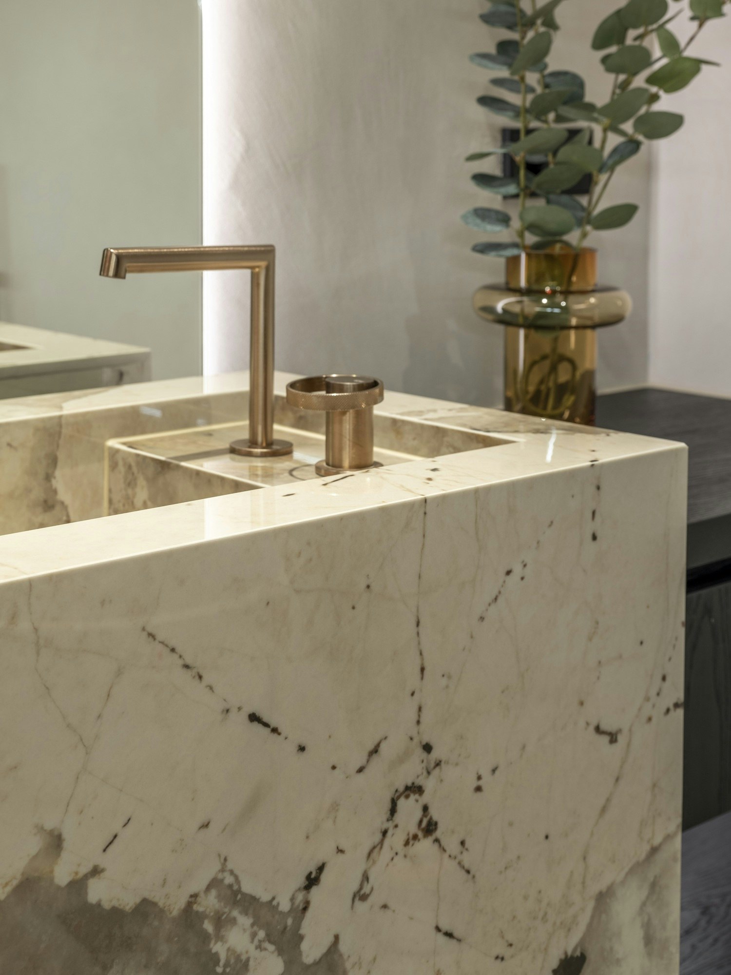 The most interesting architectural and decorative feature in this project is the custom-made washbasin made of Dekton Khalo. Together with the slanted glass wall in the shower, this forms a combination of sculptural elements and functional architecture that gives the space character. The balance between calm and expression was the guiding principle.