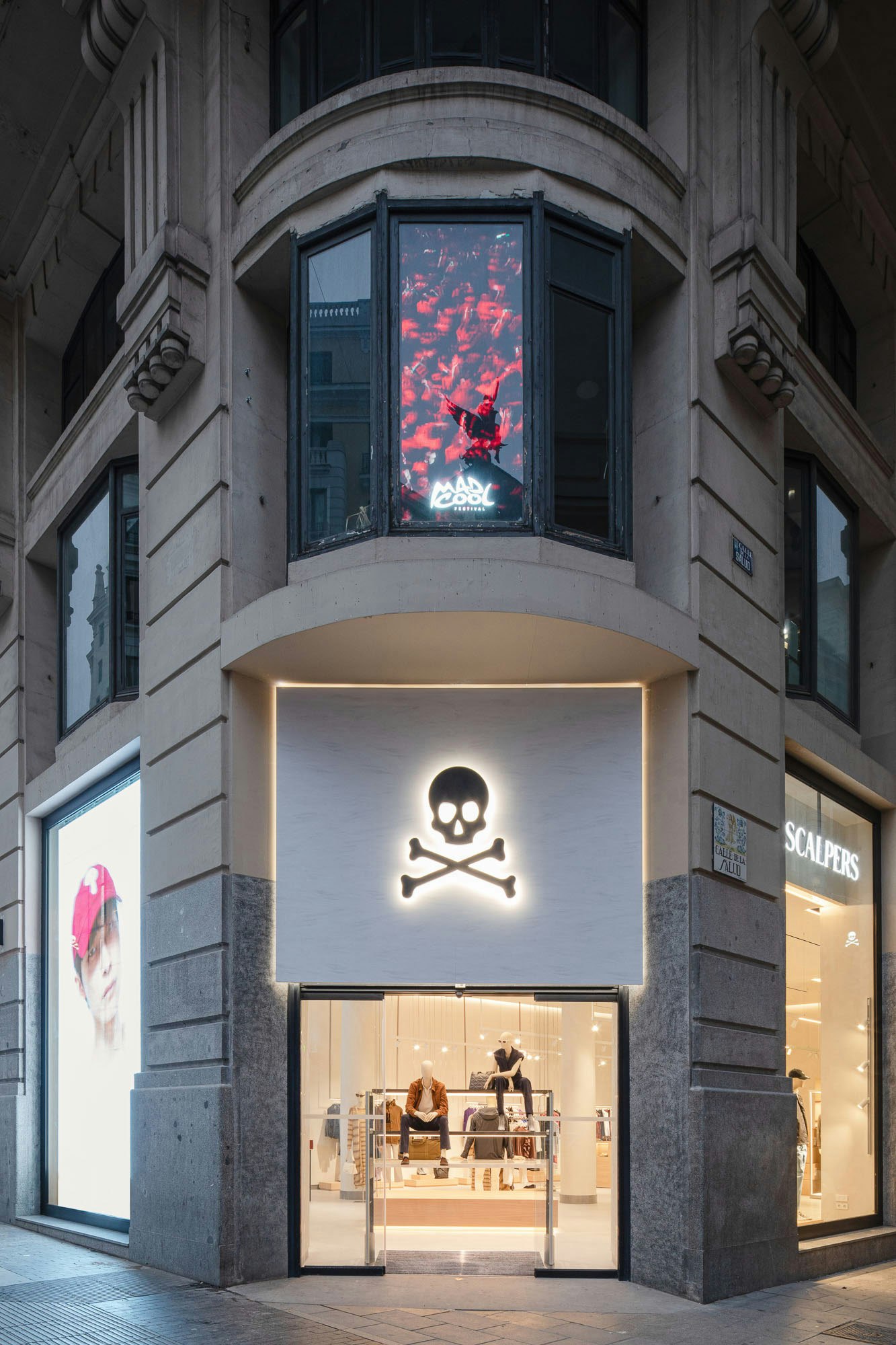 The openings in the façades overlooking the Gran Vía are used for products that must be used in combination with lightweight suspension systems, as well as translucent LED screens that make it possible to create dynamism and recreate different scenarios quickly and easily. The steel rods suspended from the ceiling allow the product to be displayed floating, without compromising the visibility of the shop from any angle. This simplicity is also reflected in the signs, which feature the well-known Scalpers logo, a skull without text.
