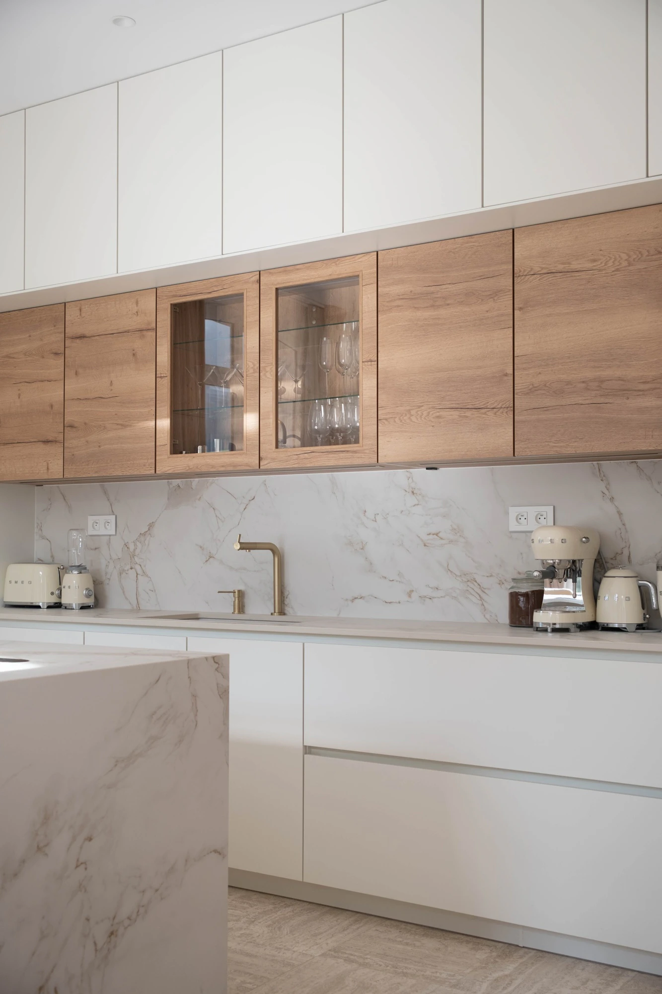 In the kitchens, Dekton Entzo stands out as the central aesthetic choice. Inspired by Calacatta marble and defined by delicate golden veining, Dekton Entzo introduces a subtle sophistication that harmonizes beautifully with the natural wood accents and crisp white cabinetry.