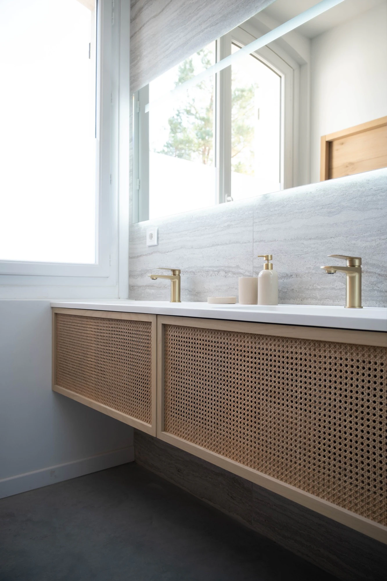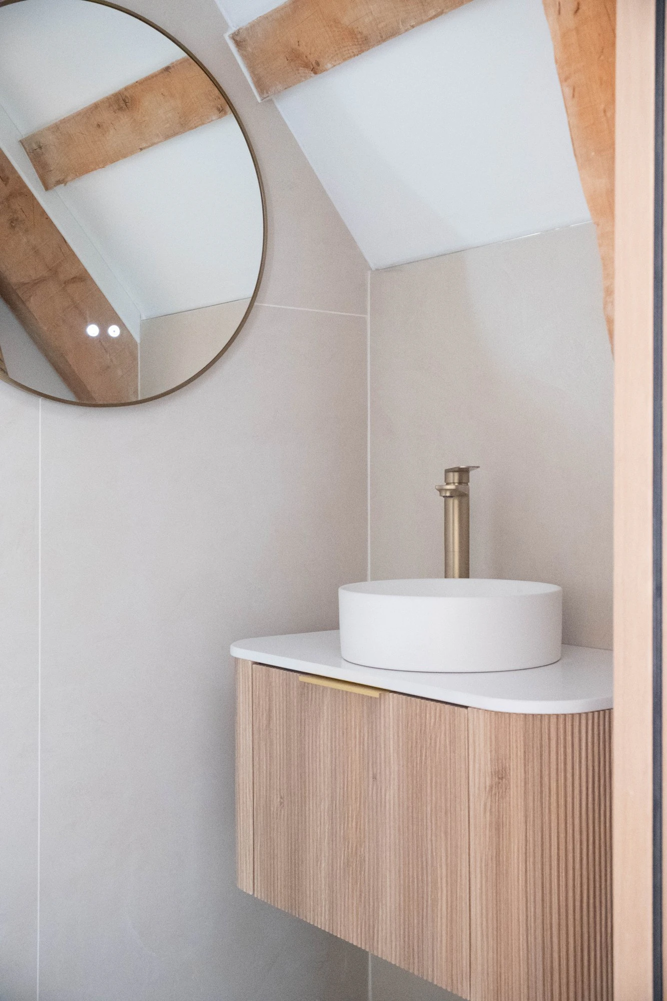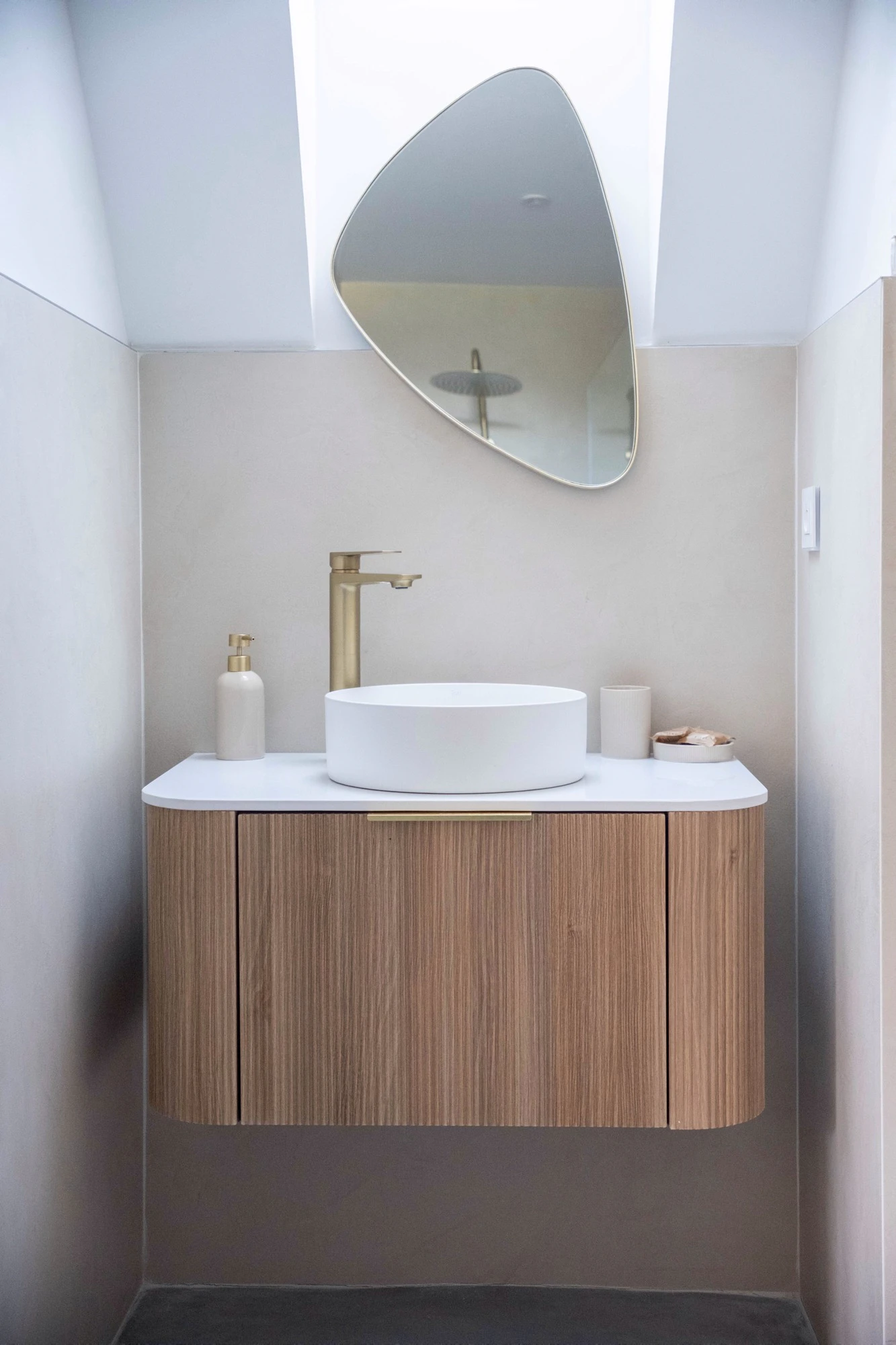 The bathrooms each express a distinct ambiance through a curated selection of four emblematic Dekton colorways: Trevi, Rem, Khalo, and Nacre. Dekton Trevi, with its soft tones inspired by Italian stone, brings timeless elegance. Dekton Rem offers a warmer interpretation of classic marble with subtly contrasted brown veining. Dekton Khalo, inspired by Patagonia quartzite, asserts a bolder personality—perfect for a statement bathroom. Dekton Nacre, with its soft satin finish and powdery texture, diffuses light beautifully and lends a serene refinement to the space. Paired with suspended wooden vanities and brushed-gold fixtures, these bathrooms evoke a sense of calm and visual coherence, designed to deliver an elevated daily experience.