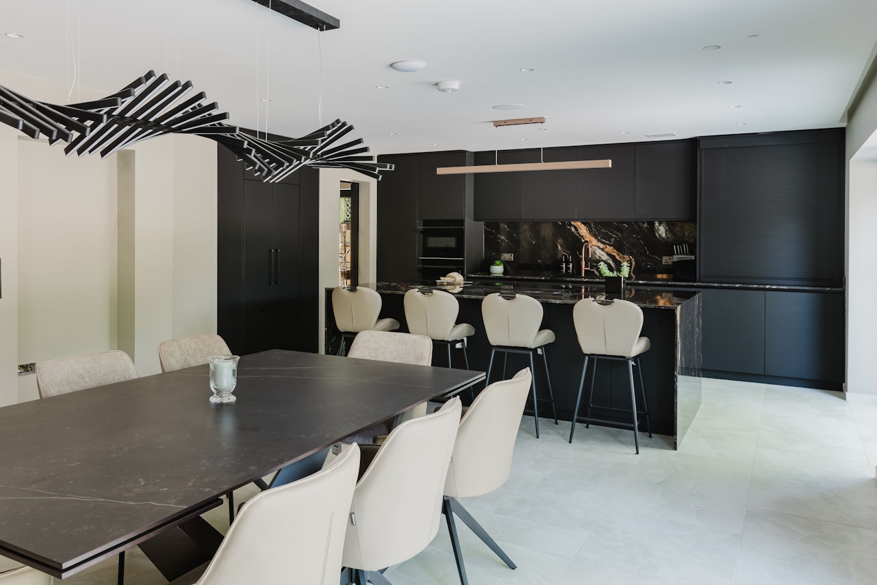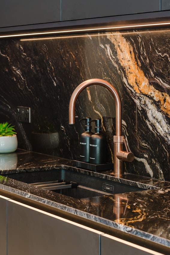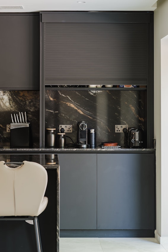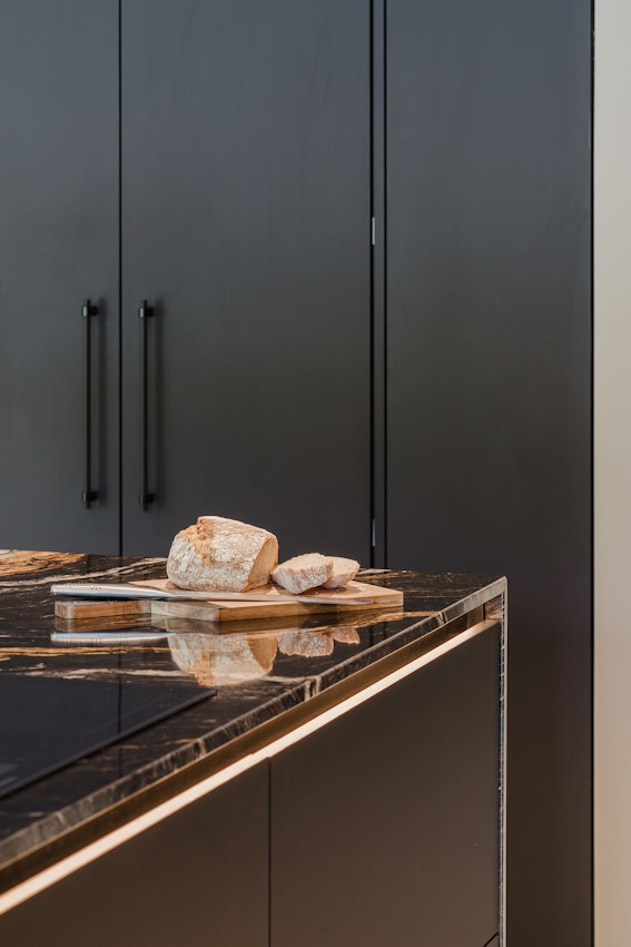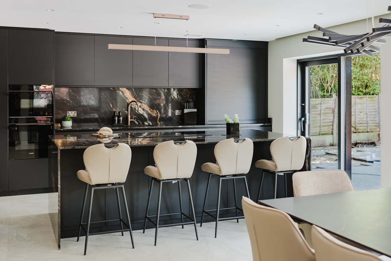 Anita’s kitchen is a striking statement of contemporary elegance, combining sleek lines with warm, tactile touches. The design revolves around a True Handleless layout in Perfect Sense Matt Black, creating a bold yet refined backdrop. The surfaces are clad in luxurious 20mm Sensa Orinoco, with a full-height splash back and waterfall edge that showcase the stone’s dramatic veining.
