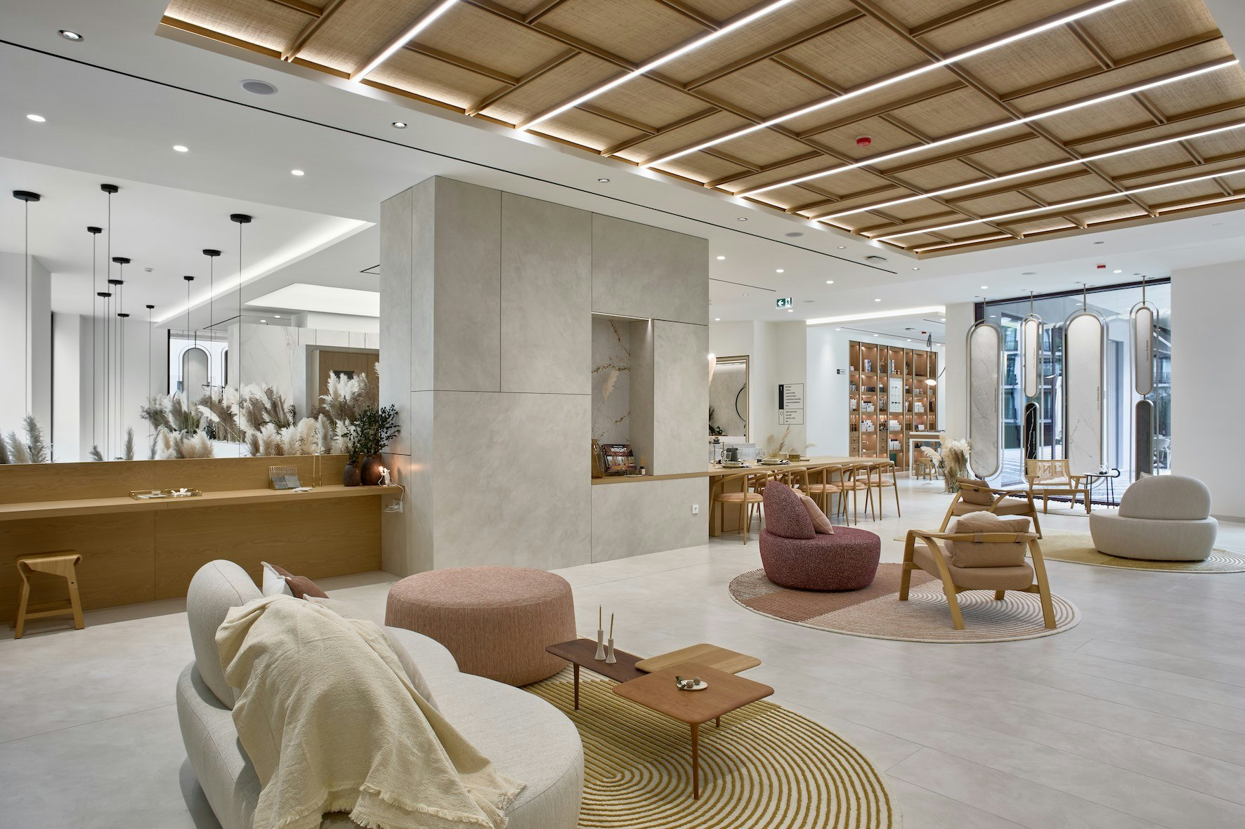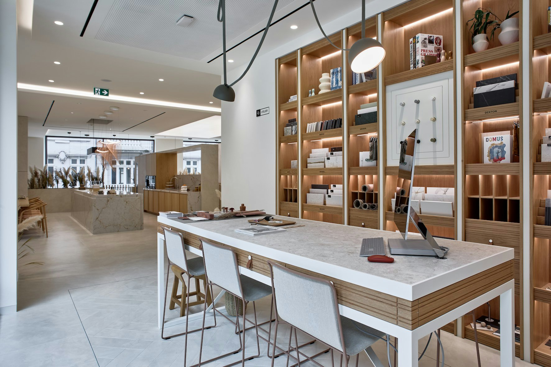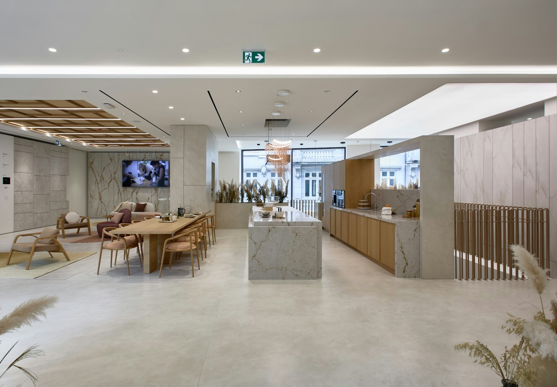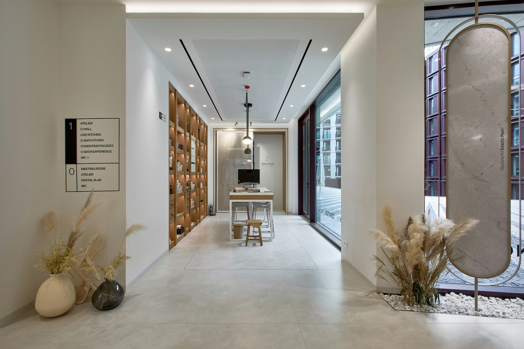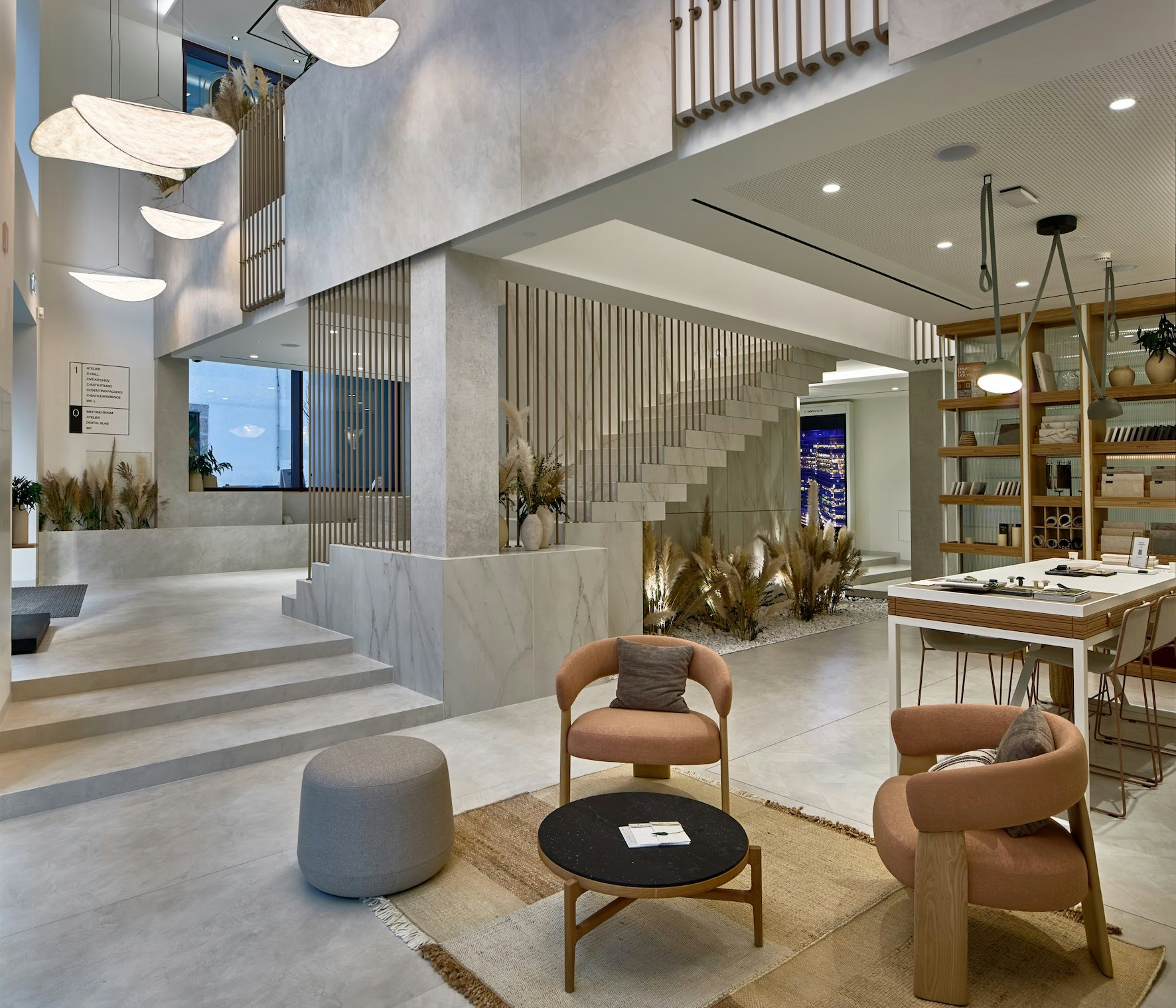 “Cosentino City Oporto” follows the main principles of this model designed to provide an immersive and inspiring experience. The lower floor houses a reception area, meeting space and an Atelier, all equipped with innovative digital tools. On the upper floor, visitors can enjoy a spectacular functional kitchen island and support area that integrates an invisible induction system. In addition to a second Atelier, on the upper floor all the company's solutions for bathroom are also displayed with different environments, as well as facades mock-ups.