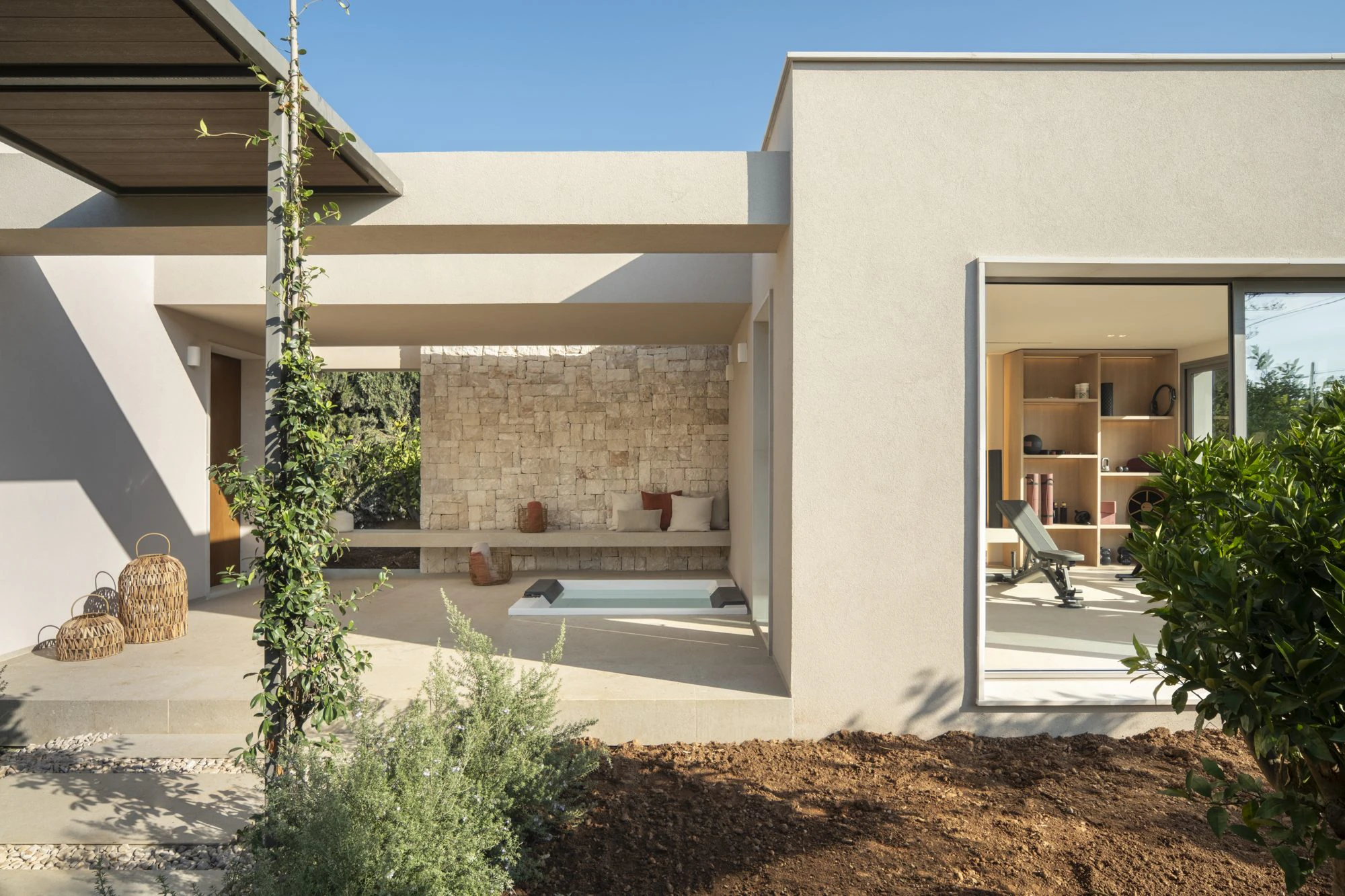This continuity is particularly visible in the porch and solarium area, where the interior flooring extends to the garden and integrates with the landscape. The material's stability against solar radiation and temperature changes typical of the Mallorcan climate was crucial for its application in these areas.