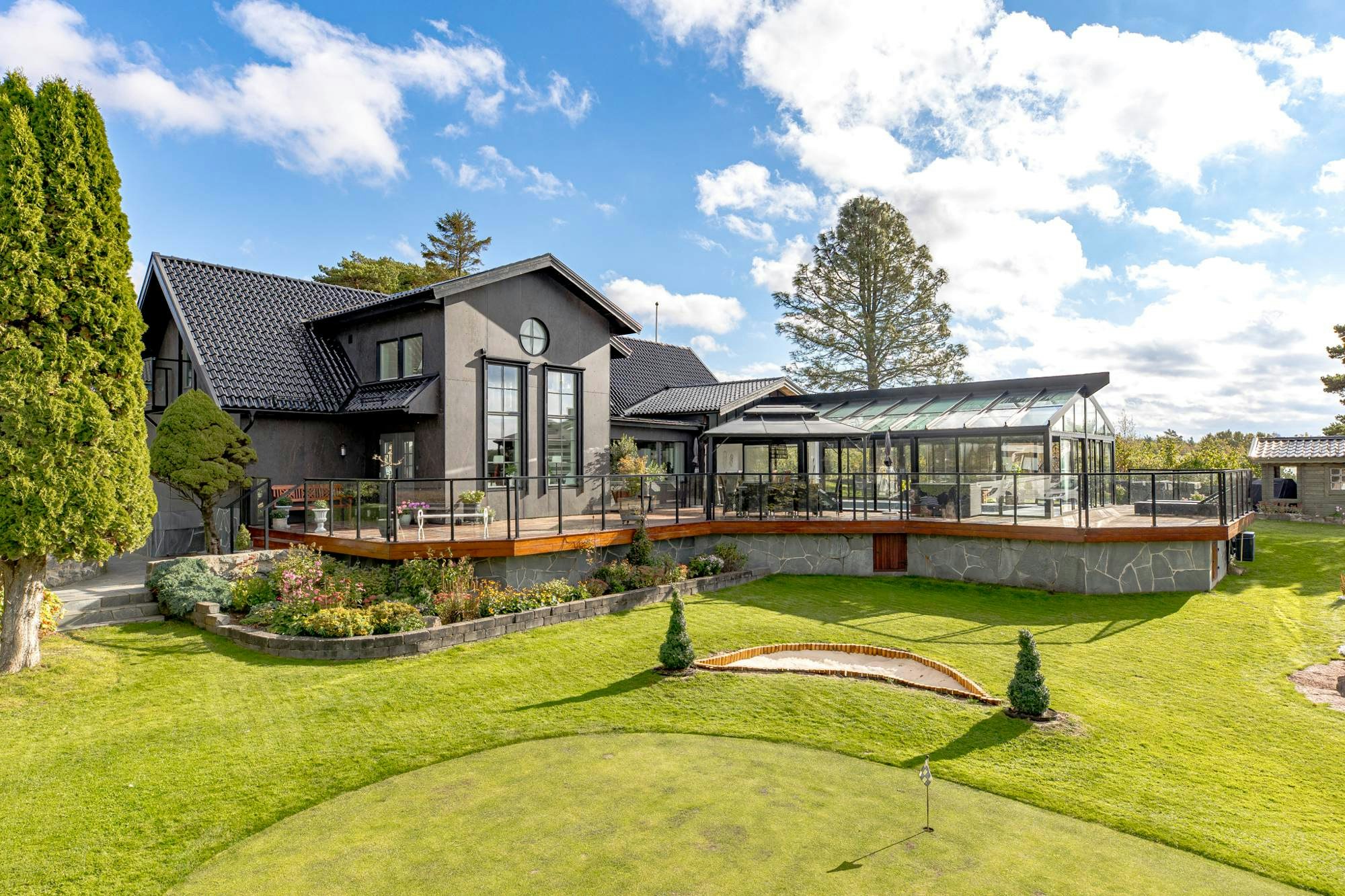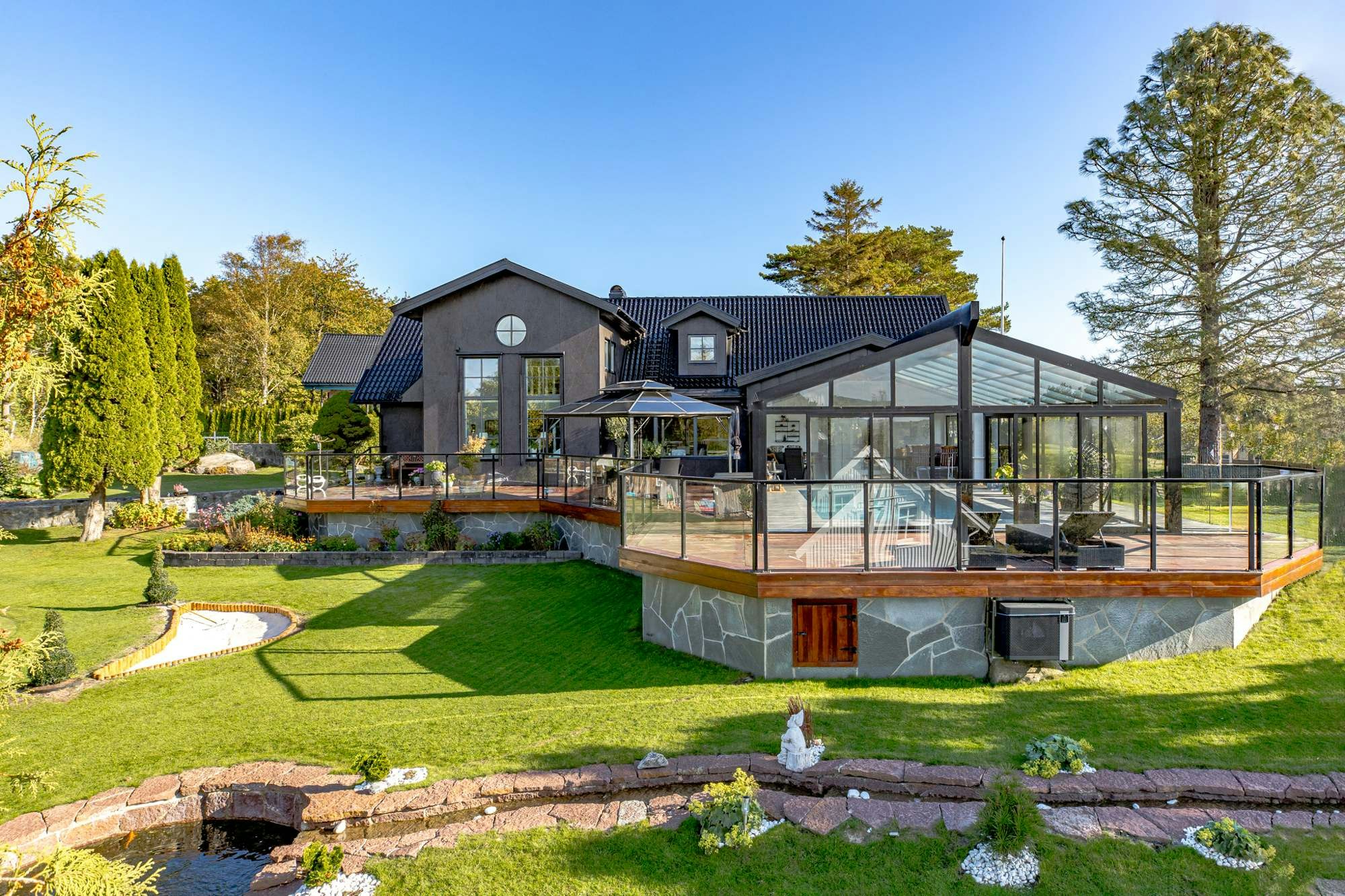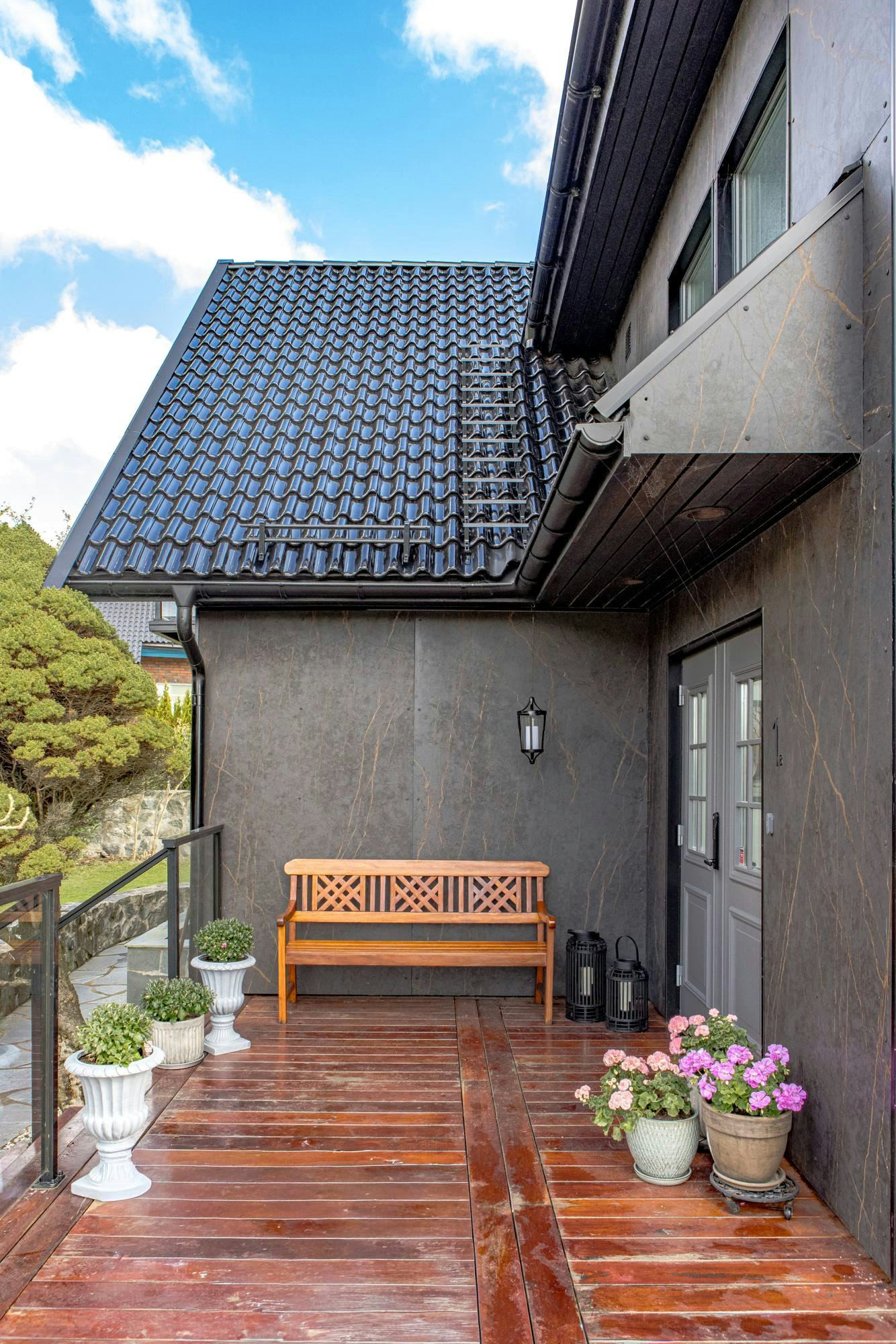 “As a designer, I chose Dekton Laurent because it combines a dark yet soft base colour with a natural variation of veins in brown and golden tones that perfectly match the new bankirai wood used to clad all the property's terraces,” says Ekman, referring to the durable tropical wood on the house's porch.