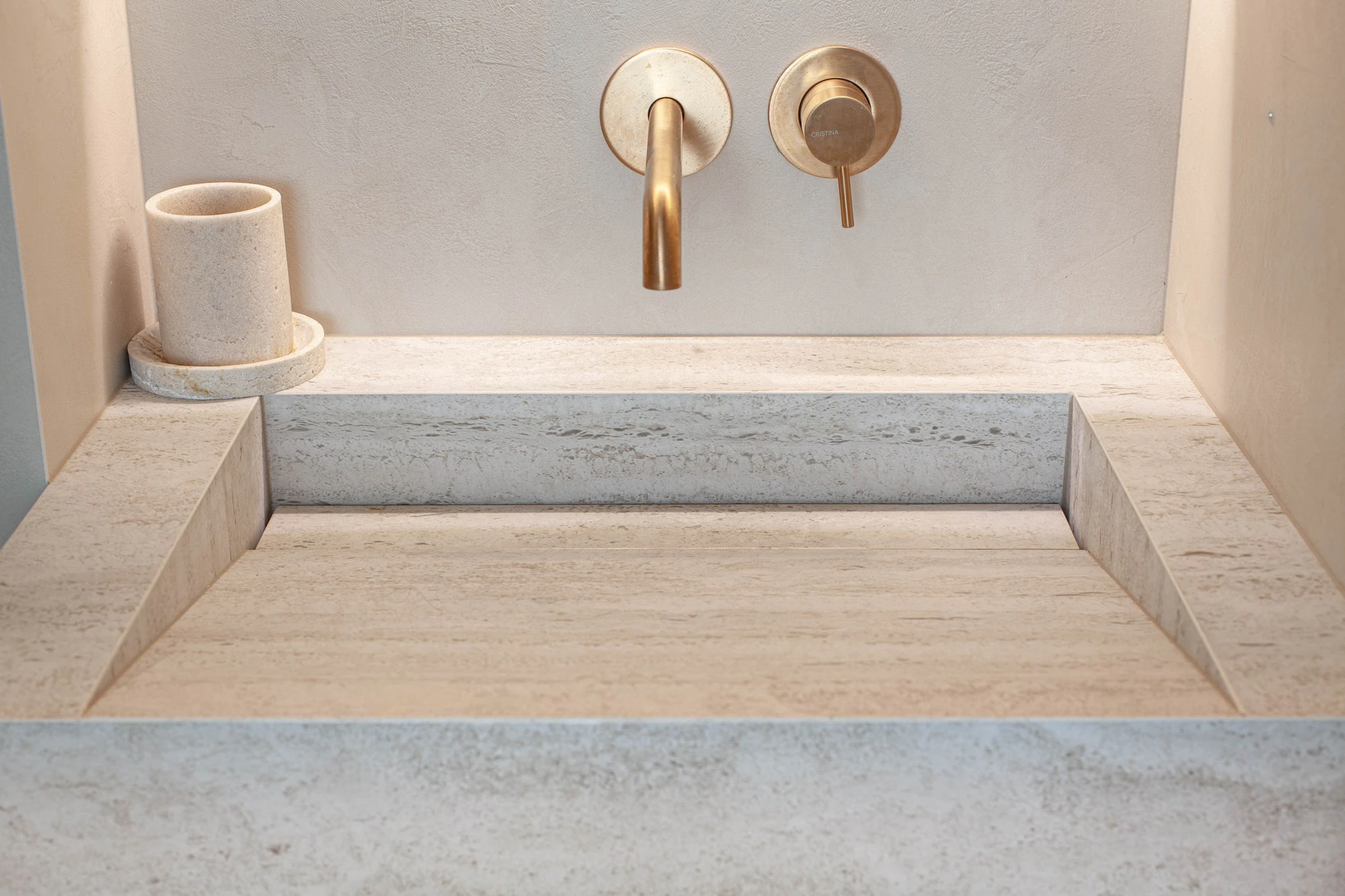 Floors and vanity tops are finished in Dekton Pietra Kode Marmorio, a contemporary reinterpretation of travertine that brings brightness and balance to the interiors. Its soft, gently veined texture enhances the sense of continuity and contributes to the creation of almost monolithic volumes, designed to stand the test of time. Installation and the fabrication of the custom-made vanity basins were carried out by Cereja Carrelage, whose craftsmanship is evident in the precision of the lines, the control of edges and the quality of the assemblies. Each element is treated as an architectural component in its own right, reinforcing the overall coherence of the project.