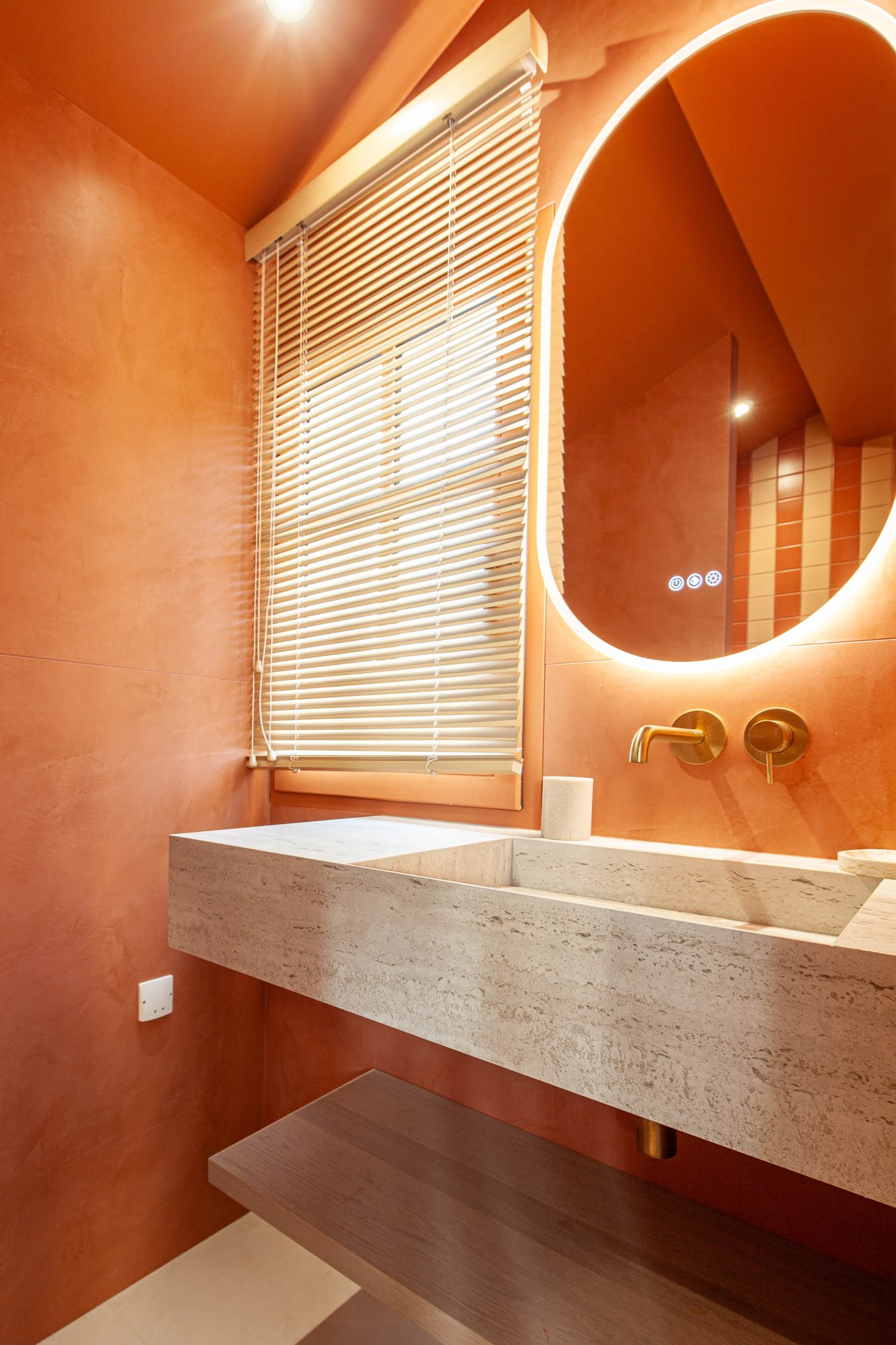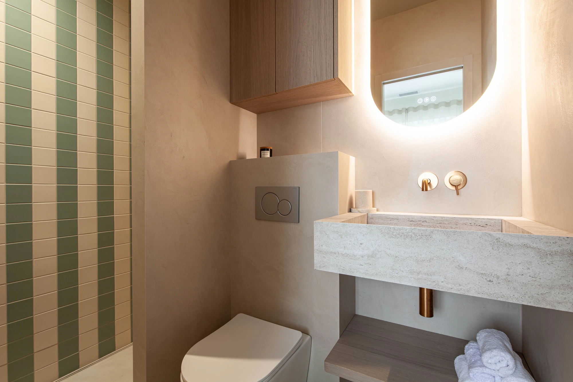 The bathrooms fully express the project’s philosophy, where aesthetics and performance are inseparable. The choice of Dekton Kraftizen, in Umber and Nacre, makes it possible to recreate the look and feel of polished concrete while eliminating its technical constraints. Dekton Umber, with its warm, earthy tones, adds depth and character, while Dekton Nacre, lighter and subtly pearlescent, reflects light and softens the volumes. These ultra-compact surfaces offer outstanding resistance, long-term stability and easy maintenance, making them particularly suitable for heavily used spaces, while maintaining a matte, mineral and contemporary appearance.