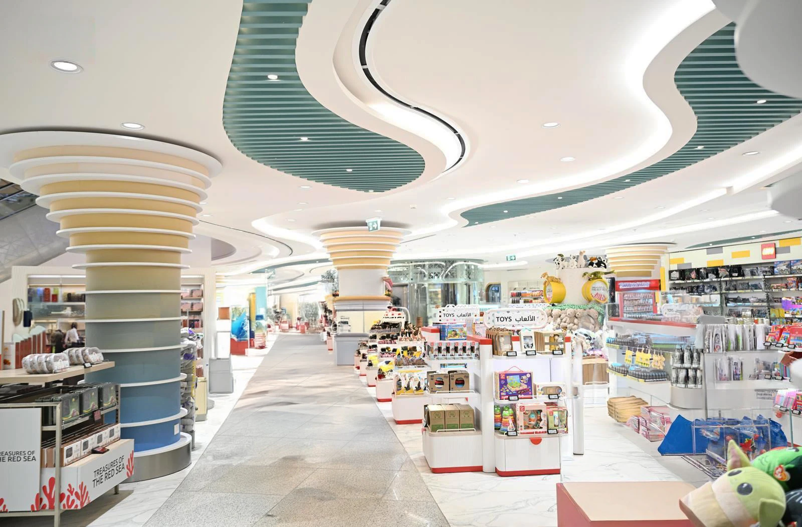The shopping experience is organised into distinct thematic zones, carefully choreographed. The Perfumery and Cosmetics area evokes the desert through oasis-inspired forms, palm motifs, and warm champagne gold tones. Tobacco, Sweets, and Kids create a marine atmosphere with fluid lines and reflective surfaces reminiscent of the Red Sea. Meanwhile, the Fashion area elevates the narrative towards the sky, using celestial geometries and sophisticated materials that express lightness, movement, and spirituality.