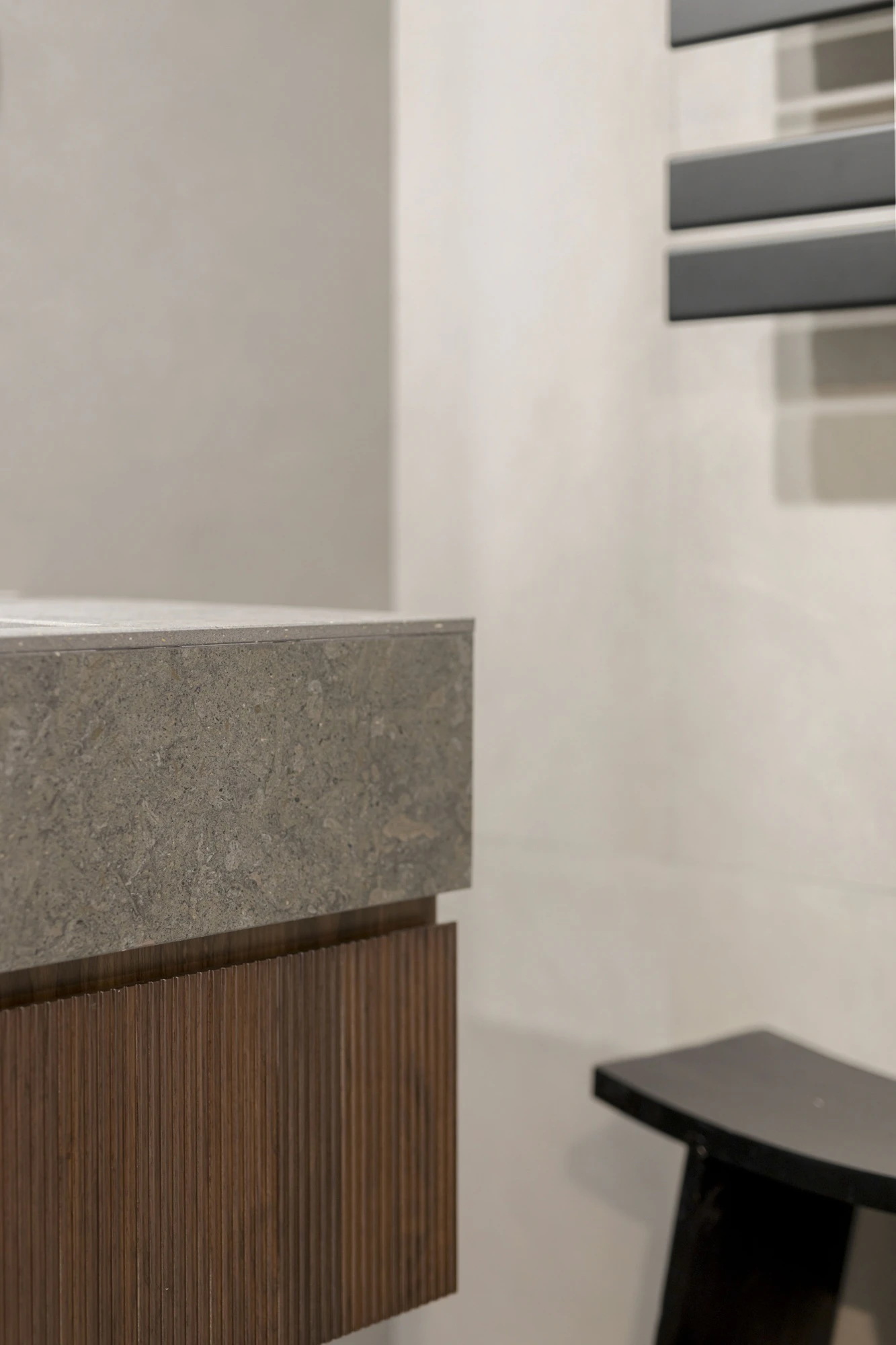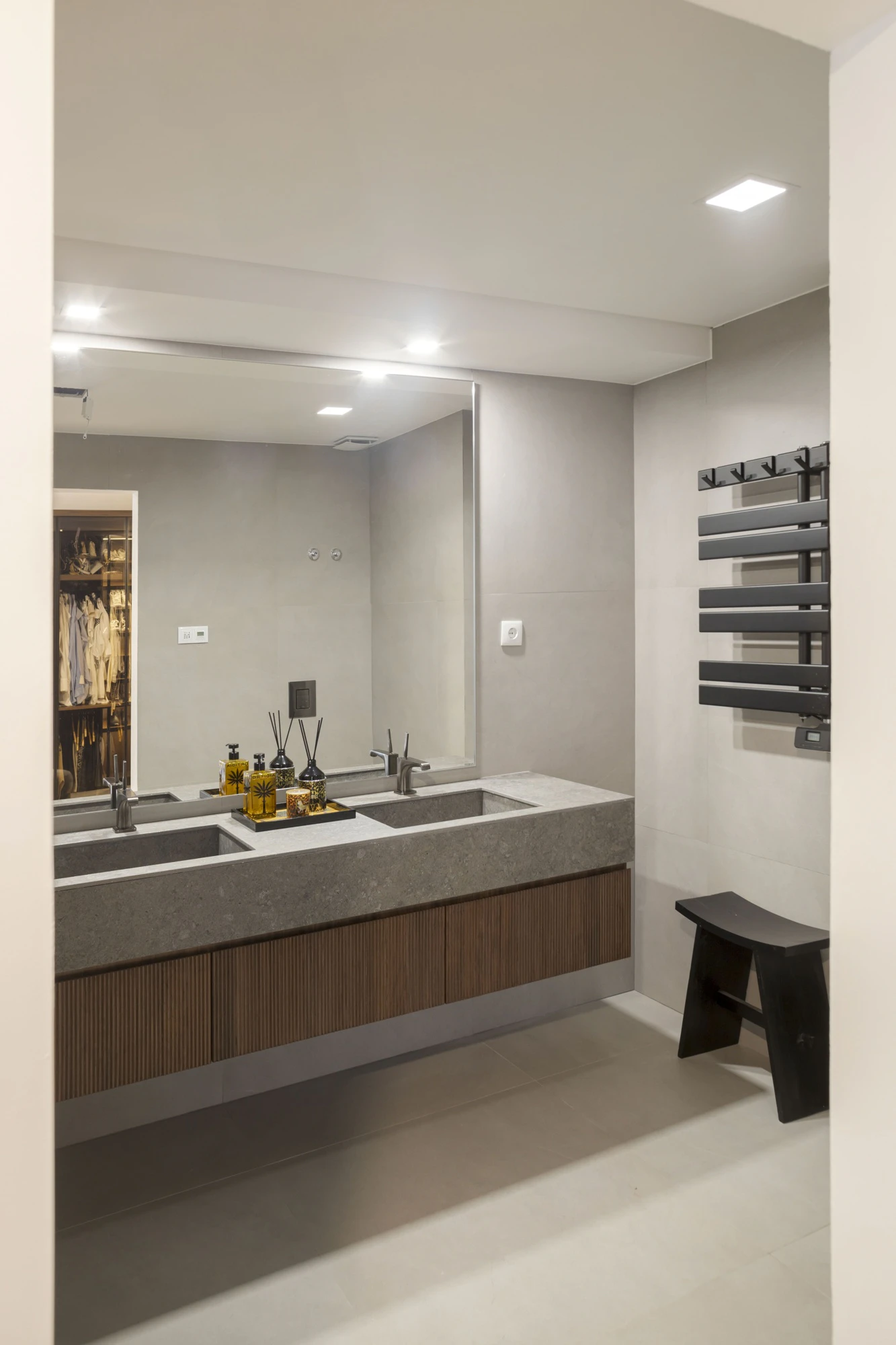 To continue with that brutalist and industrial aesthetic, yet minimalist and simple, Dekton Grafite was chosen for the bathroom worktop. Its dark base, a mix of black and grey interspersed with whitish and reddish cloud-like spots, reinterprets the texture of fine-grained dark limestone. The double sink features a wooden slatted cabinet underneath with a slight oriental touch. The rest of the bathroom, in grey, helps maintain the aesthetic that dominates the rest of the project.