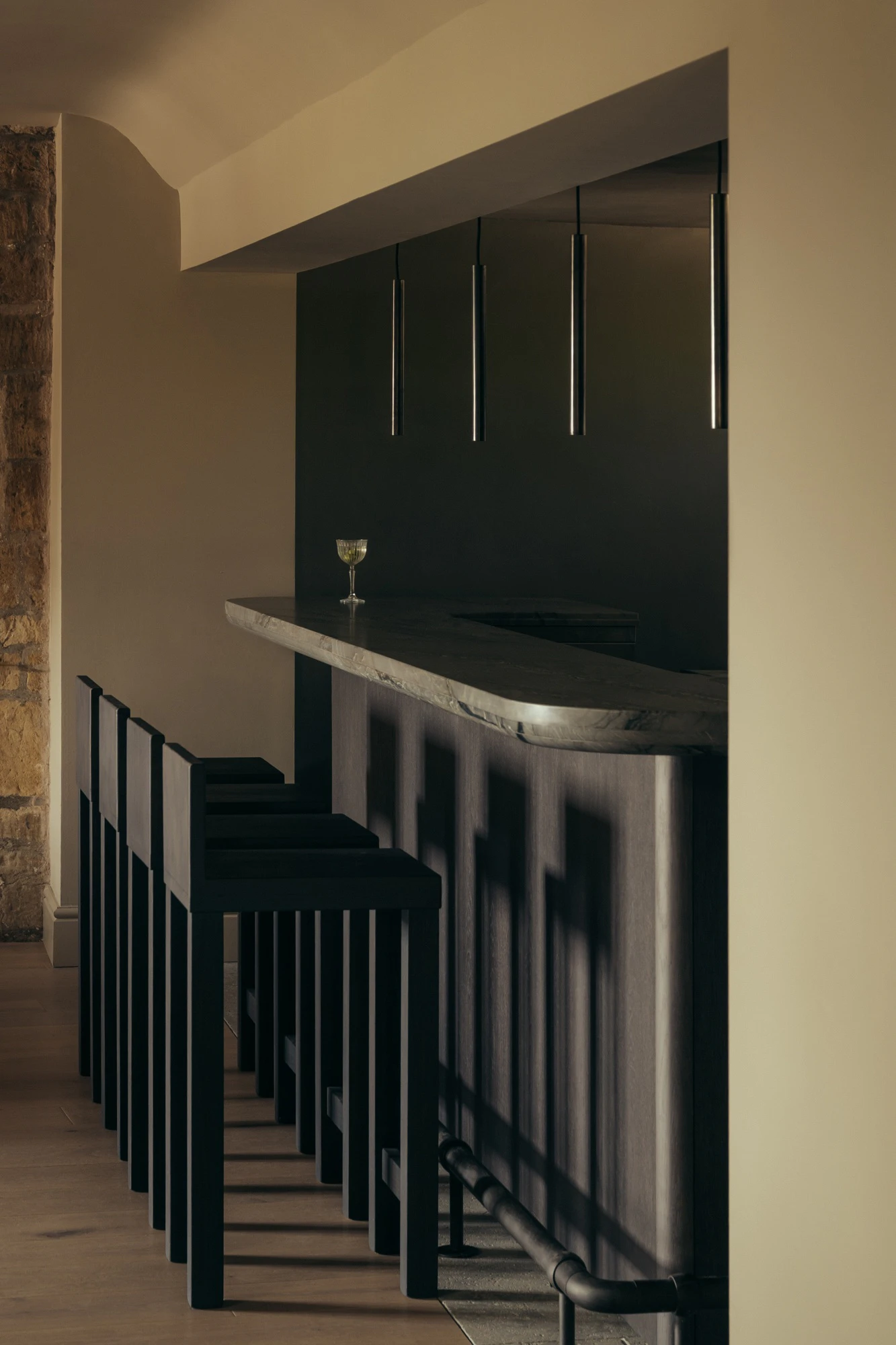 In this sophisticated and organic universe, Sensa Platino finds its place on the bar worktop, which serves cocktails, tea, coffee, and wines from around the world. The quartzite from the interior of Brazil, whose mineral formation brings a sense of purity, evokes the movement of ocean waves with its pattern. Its design perfectly complements the pronounced grain of the dark wood that supports it.