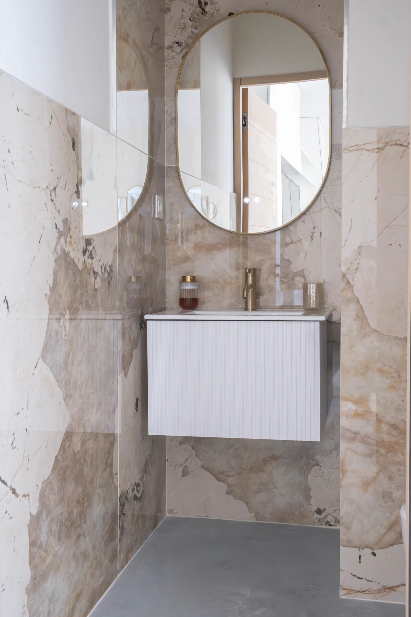 The bathrooms each express a distinct ambiance through a curated selection of four emblematic Dekton colorways: Trevi, Rem, Khalo, and Nacre. Dekton Trevi, with its soft tones inspired by Italian stone, brings timeless elegance. Dekton Rem offers a warmer interpretation of classic marble with subtly contrasted brown veining. Dekton Khalo, inspired by Patagonia quartzite, asserts a bolder personality—perfect for a statement bathroom. Dekton Nacre, with its soft satin finish and powdery texture, diffuses light beautifully and lends a serene refinement to the space. Paired with suspended wooden vanities and brushed-gold fixtures, these bathrooms evoke a sense of calm and visual coherence, designed to deliver an elevated daily experience.