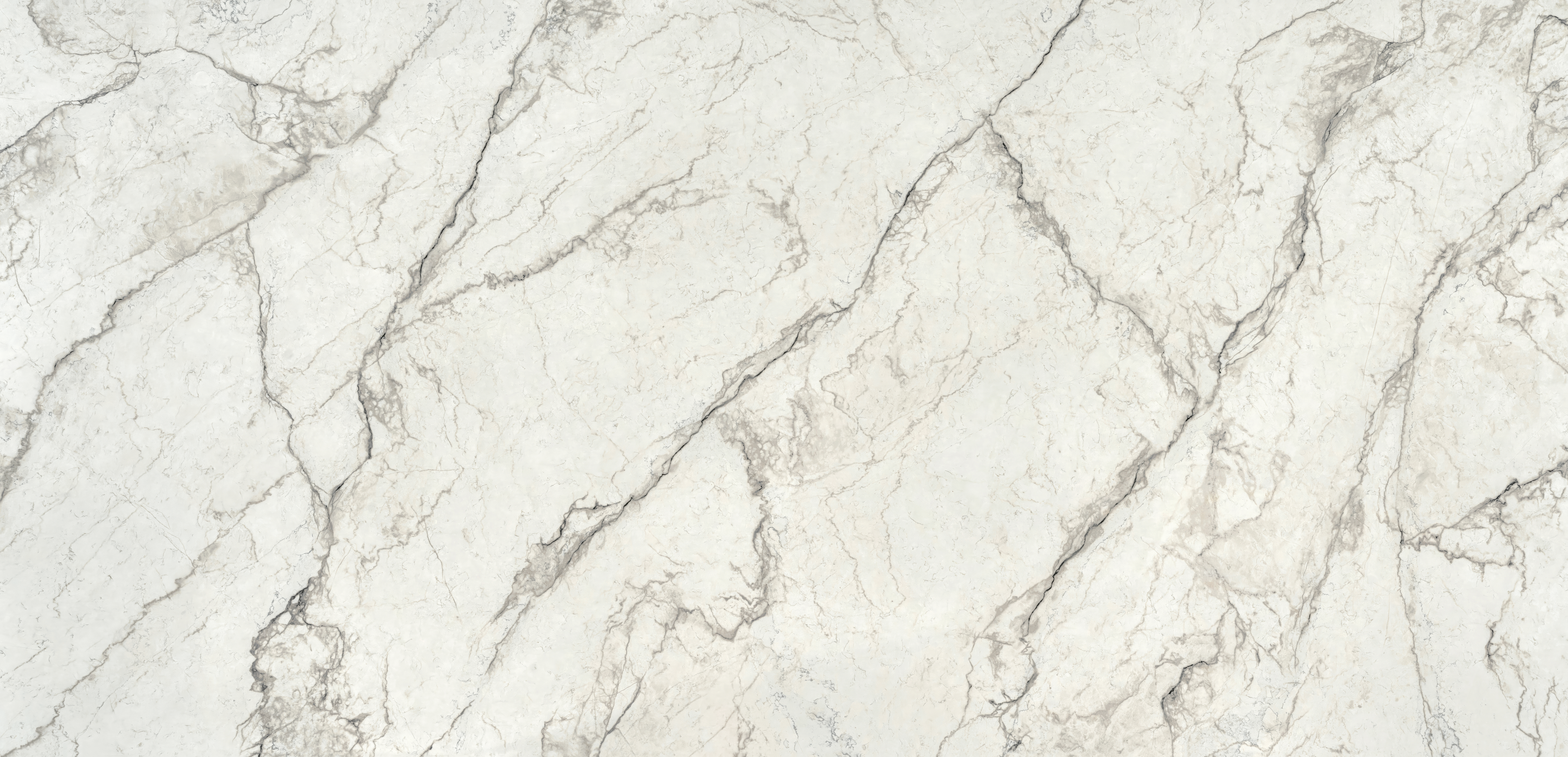 Gray and blue layers in striking motion. A luminous white base is traced with striking gray and blue veins in motion that flow across the surface with intention, bringing a touch of light and personality that adds a sense of wonder to countertops and interiors.