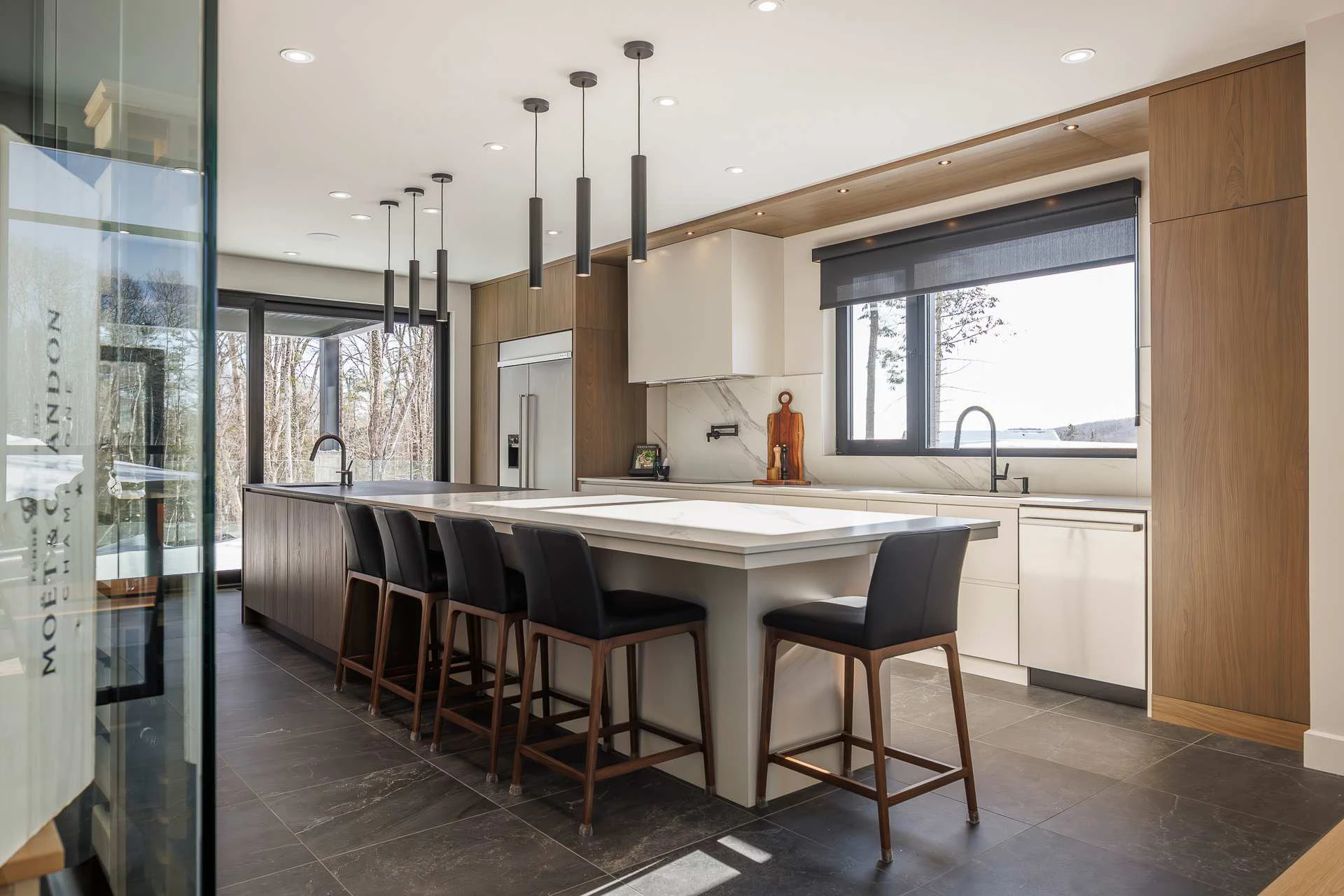 Sculpted, architectural, and modern, this kitchen by Richard & Levesque Cuisines Salles de Bain is defined by its bold central island and integrated appliance wall. Designed as the centerpiece of a high-end residence, the space exemplifies understated luxury through precision and proportion.